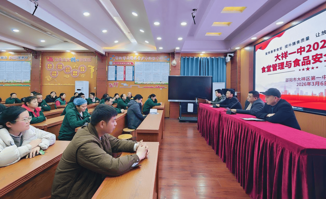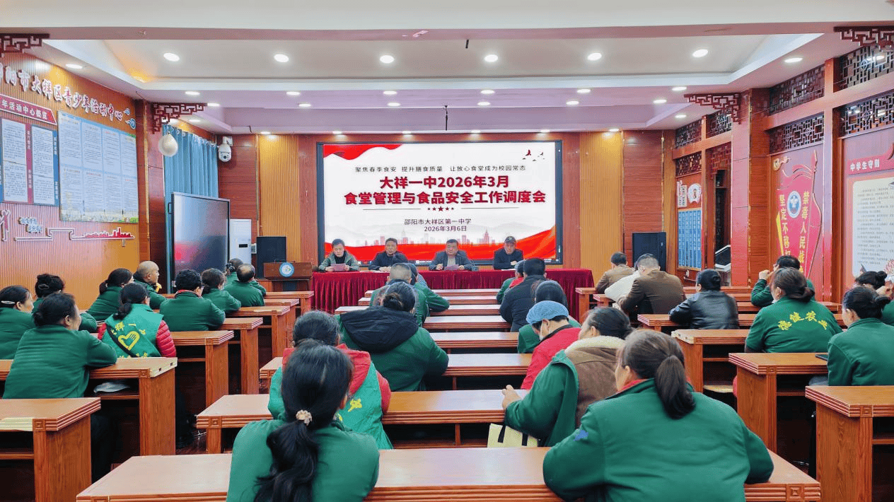 本网讯(通信员 吴金灿 唐乘乘)3月6日,邵阳市大祥区第一中学召开了2026年3月份食堂办理取食物平安工做安排会,学校带领、食堂一线员工等齐聚一堂,环绕“聚焦春季食安,提拔炊事质量,让安心食堂成为校园常态”这一从题,共商春季食堂办理取食物平安大计。